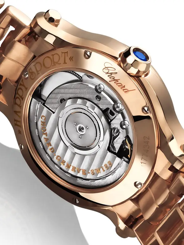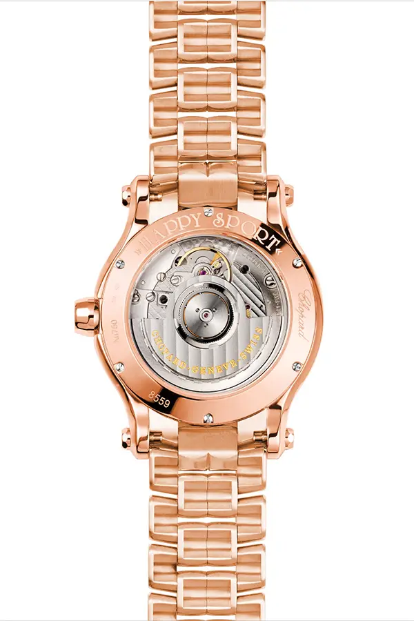 Chopard Happy Sport 274808-5002 — воплощение женской элегантности, сочетающее золото, бриллианты и швейцарское часовое мастерство. Круглый корпус диаметром 36 мм, выполненный полностью из 18-каратного розового золота, сияет мягким, тёплым блеском, притягивая взгляды.