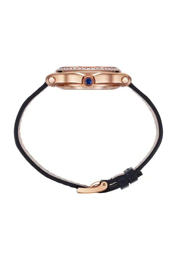 Корпус диаметром 33 мм из розового золота 18 к украшен циферблатом, инкрустированным бриллиантами, защищённым сапфировым стеклом с антибликовым покрытием. Контраст тёплого золота и сияющих камней придаёт часам изысканный характер, а водонепроницаемость до 30 м делает их идеальными как для повседневного ношения, так и для особых случаев.