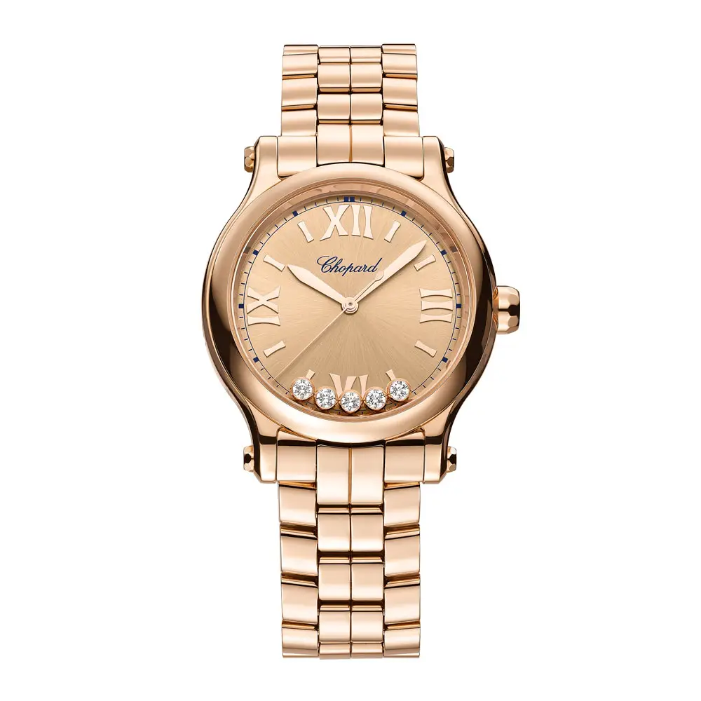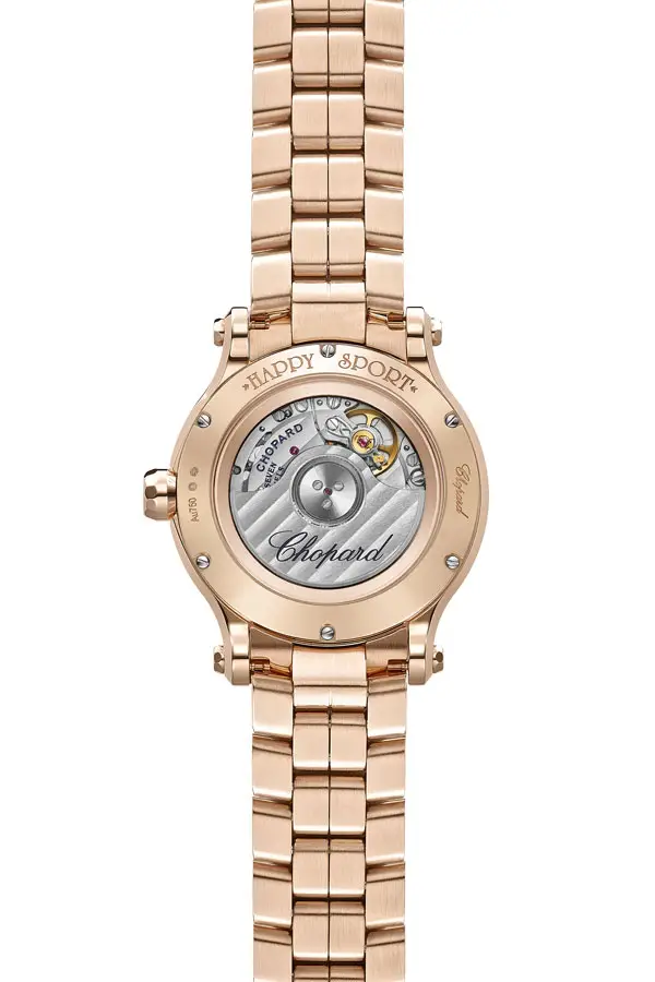 Chopard Happy Sport 275378-5008 — воплощение гармонии швейцарского мастерства, розового золота 18 карат и сияющих бриллиантов. Эта изысканная женская модель отражает дух коллекции Happy Sport — игривость, движение и радость жизни, представленные в элегантной форме.