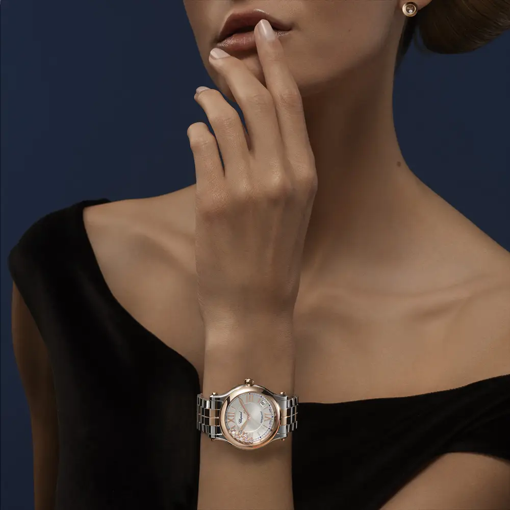 Эта элегантная модель из коллекции Happy Sport сочетает этическое розовое золото 18 карат и Lucent Steel™, создавая гармоничный биметаллический образ в овальном корпусе диаметром 36 мм. Серебристый циферблат с центральным гильоше дополняют фирменные свободно движущиеся бриллианты между двумя сапфировыми стёклами, придавая модели ювелирную, игриво-роскошную эстетику.