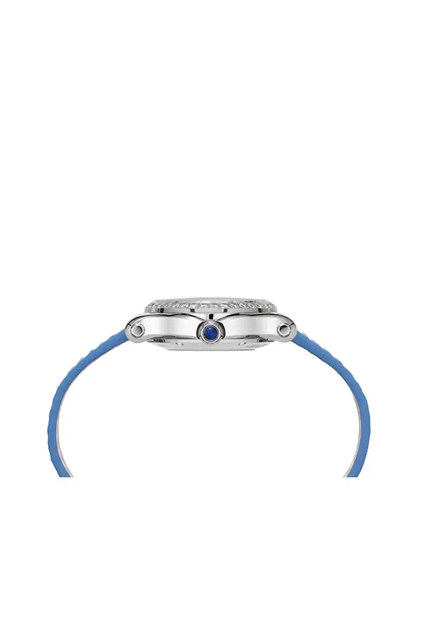 Круглый корпус диаметром 30 мм выполнен из полированной нержавеющей стали и украшен безелем с бриллиантами, придающим часам сияющий, благородный вид. Сапфировое стекло защищает синий аналоговый циферблат с бриллиантами, между двумя стеклами которого свободно движутся фирменные плавающие бриллианты, создавая эффект танца света при каждом движении руки.