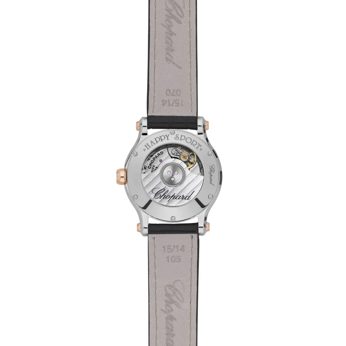 Chopard Happy Sport 278573-6015 – это изысканное сочетание швейцарской точности, утончённого дизайна и выразительного стиля. Круглый корпус диаметром 30 мм, выполненный из нержавеющей стали, дополнен безелем из розового золота 18 карат с бриллиантами, создающим элегантный и дерзкий контраст.