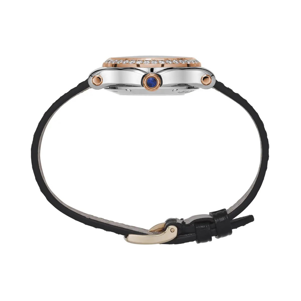 Под сапфировым стеклом расположен серебристый циферблат с «танцующими» бриллиантами, которые придают часам живость, игру света и утончённость.