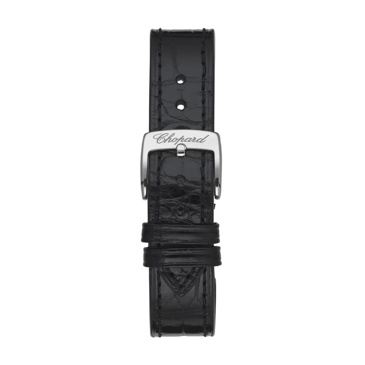 Чёрный ремешок из кожи аллигатора с классической пряжкой завершает образ благородной строгости. Внутри работает механизм с автоматическим подзаводом, обеспечивая точность без необходимости ручной заводки.