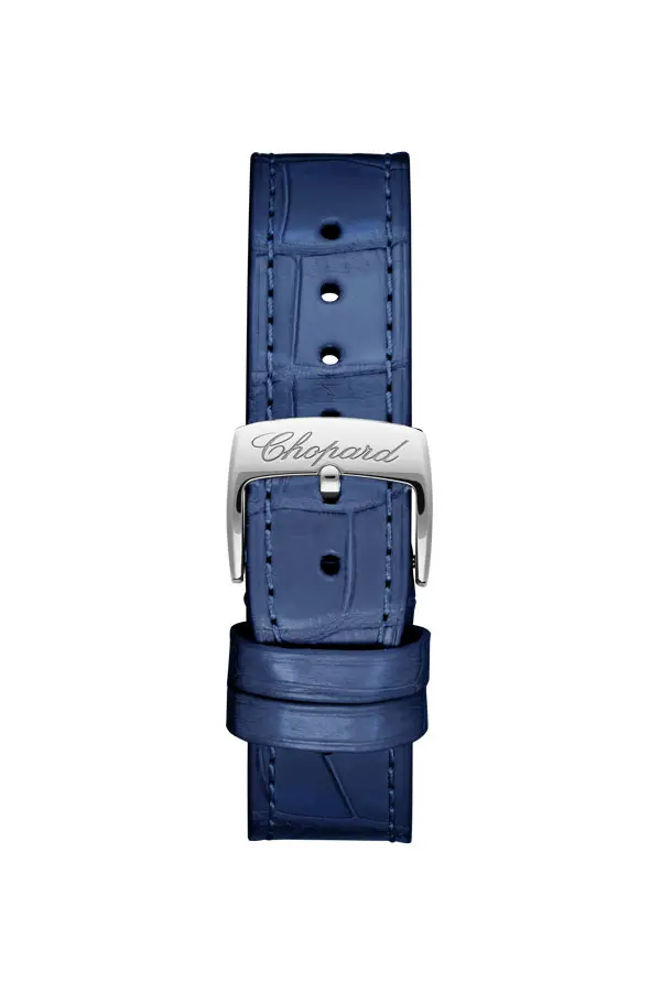 Синий ремешок из кожи аллигатора с классической пряжкой подчёркивает изысканный характер модели.
