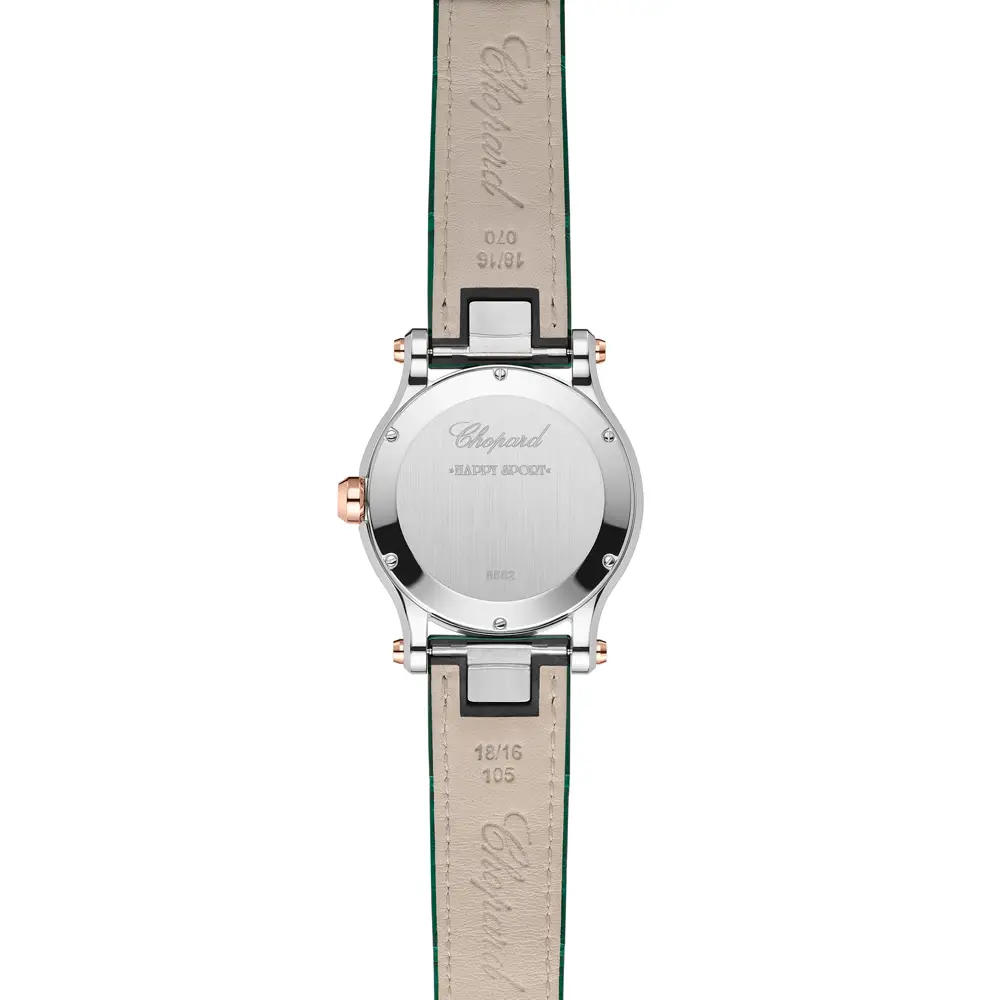 Смелость, свежесть и неповторимый стиль – Chopard Happy Sport 278582-6005 созданы для женщин, стремящихся к элегантности с изюминкой. Круглый корпус из нержавеющей стали диаметром 36 мм обрамлён безелем из 18-каратного розового золота, придающим часам утончённую теплоту.
