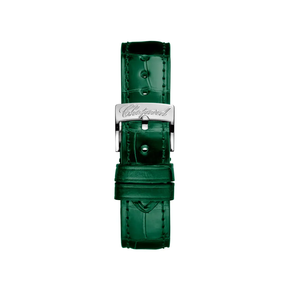 Под сапфировым стеклом сияет выразительный зелёный циферблат с подвижными бриллиантами, которые сверкают при каждом движении, словно капли росы на утреннем солнце. Удобная дата дополняет функциональность модели.