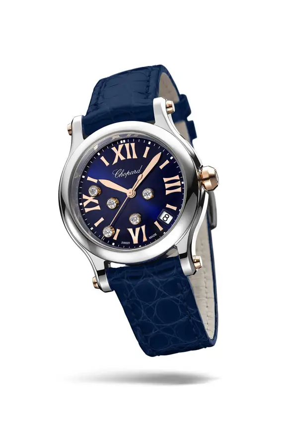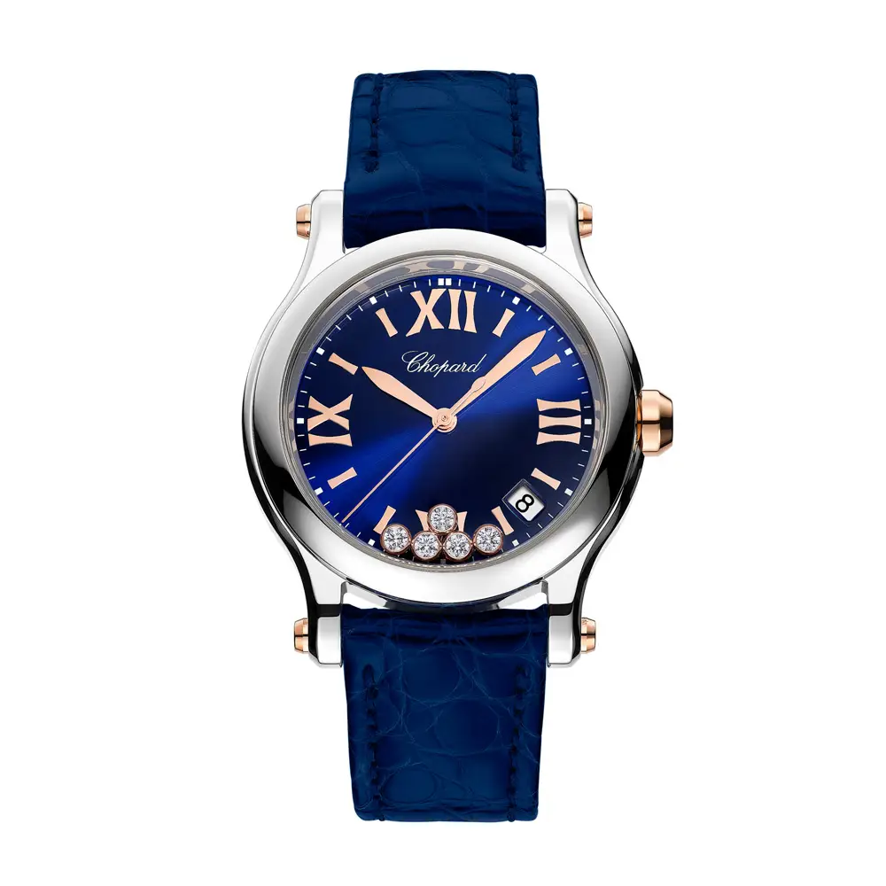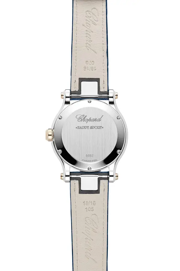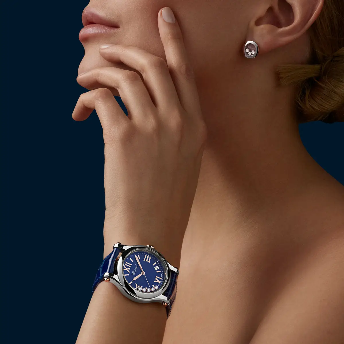Корпус из нержавеющей стали диаметром 36 мм с рифлёным безелем защищён сапфировым стеклом с антибликовым покрытием. Синий циферблат с аккуратным указателем даты на позиции 4 часов выглядит элегантно и гармонично, а пять «танцующих бриллиантов» придают модели фирменный облик Happy Sport — символ радости и движения. Водонепроницаемость до 30 метров делает часы практичными для повседневного ношения.