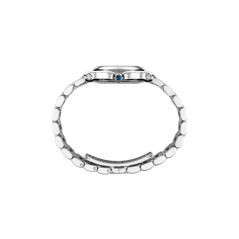 Круглый корпус из нержавеющей стали диаметром 30 мм и стальной безель обрамляют серебристый циферблат, по которому легко скользят свободно движущиеся бриллианты, добавляя игривый блеск.