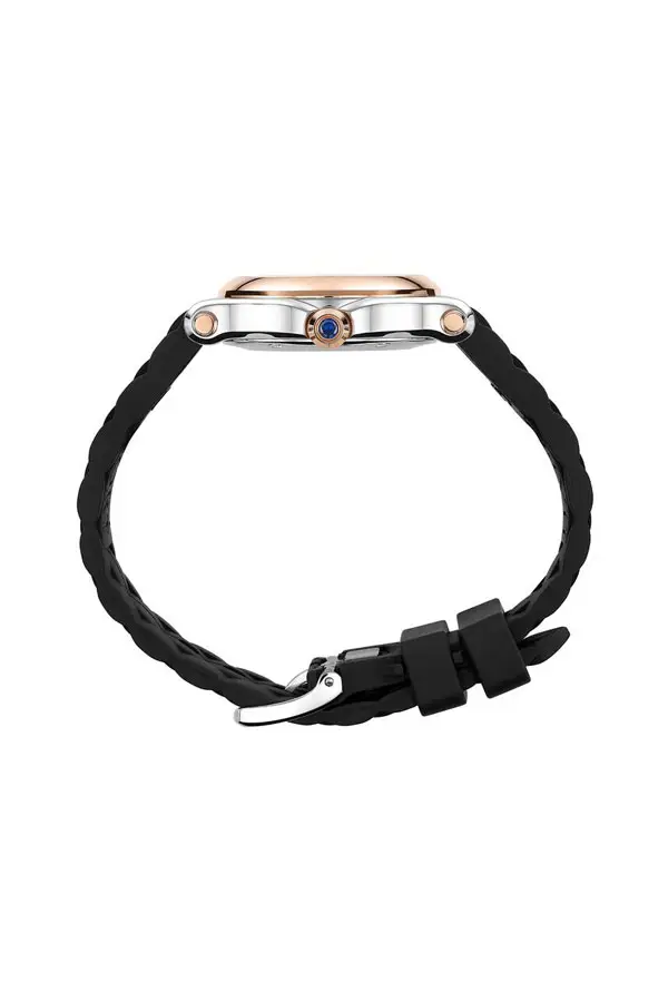 Круглый корпус диаметром 30 мм выполнен из нержавеющей стали, а безель из 18-каратного розового золота добавляет теплый благородный блеск. Под сапфировым стеклом расположен серебристый циферблат с движущимися бриллиантами, танцующими при каждом движении руки.