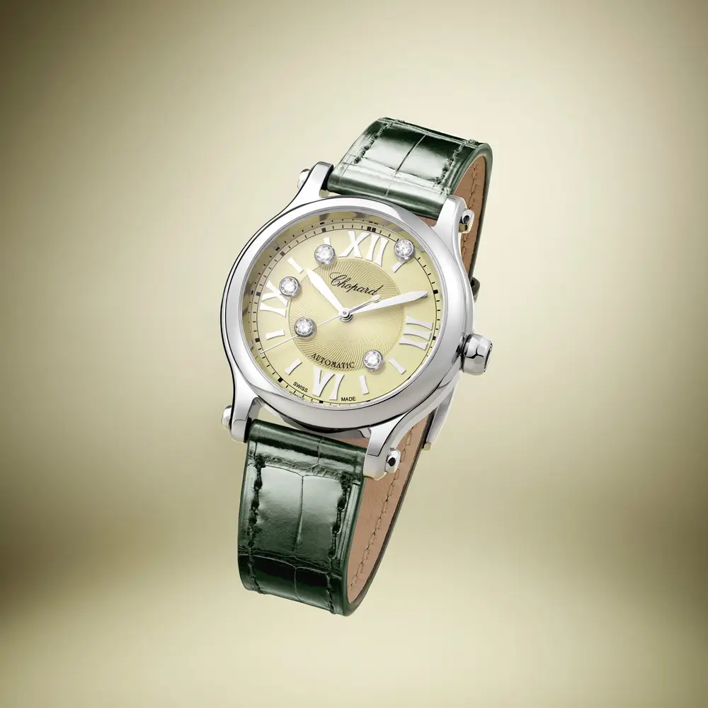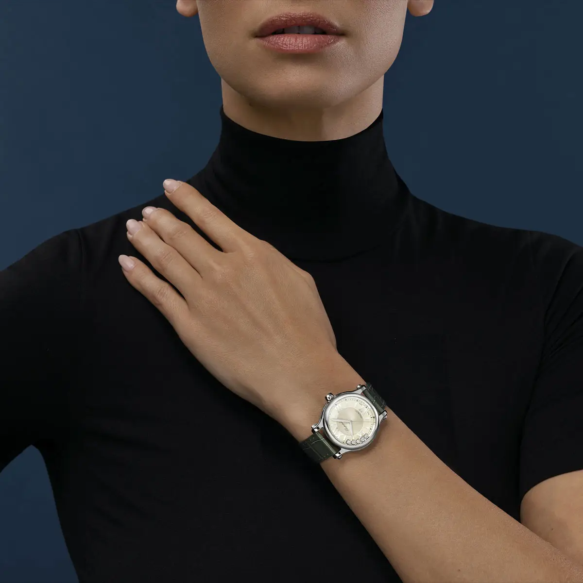 Циферблат цвета слоновой кости украшен «танцующими» бриллиантами, которые свободно движутся между двумя сапфировыми стёклами, создавая мягкую игру света. Этот фирменный элемент коллекции Happy Sport символизирует свободу, радость и женственность.