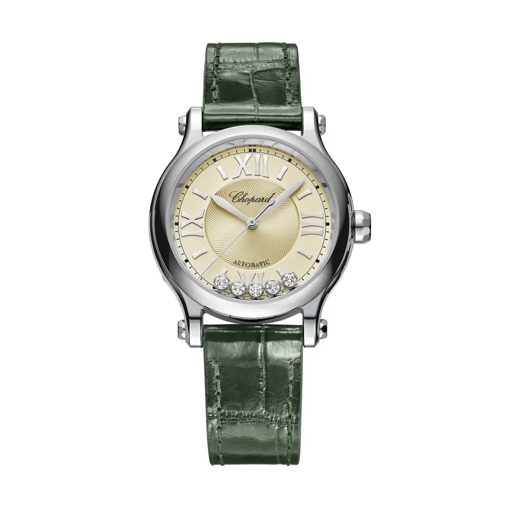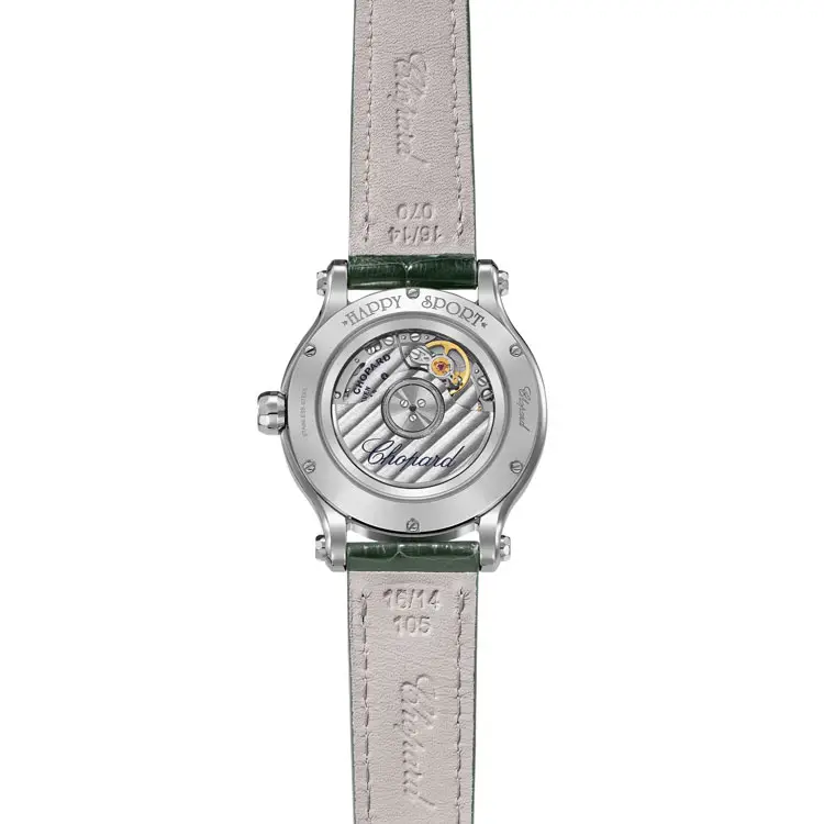 Внутри установлен автоматический калибр CHOPARD 09.01-C с запасом хода 42 часа, обеспечивающий точность и надёжность. Зелёный ремешок из кожи аллигатора добавляет смелый и утончённый акцент. Chopard Happy Sport 278608-3010 — это не просто часы, а украшение, воплощающее уверенность и гармонию женской силы.