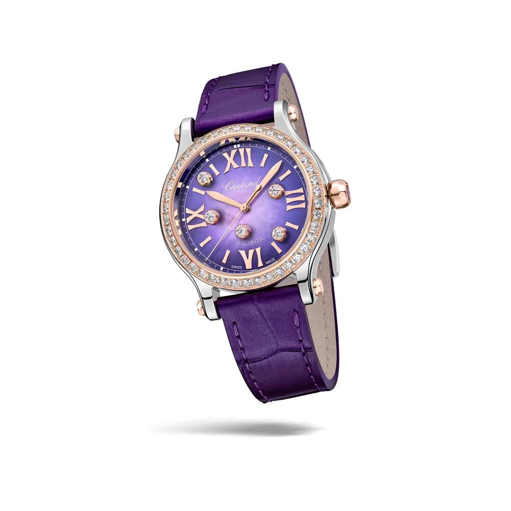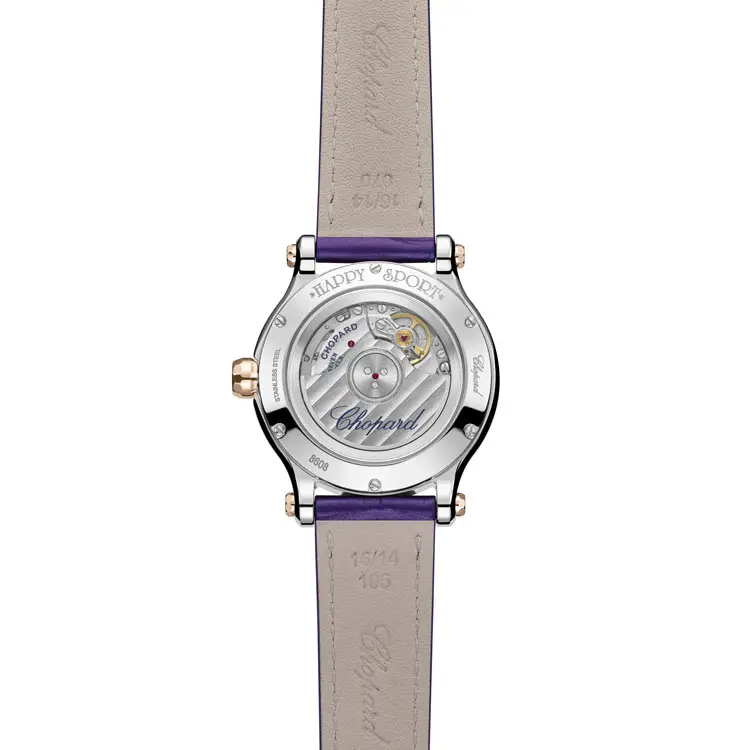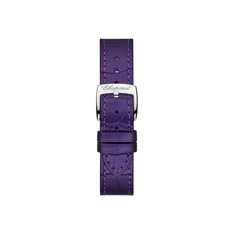 Внутри установлен автоматический калибр CHOPARD 09.01-C с резервом хода 42 часа. Ремешок из фиолетовой кожи аллигатора с классической застёжкой подчёркивает изысканный стиль. Водонепроницаемость до 30 метров делает модель символом роскоши, свободы и радости жизни.