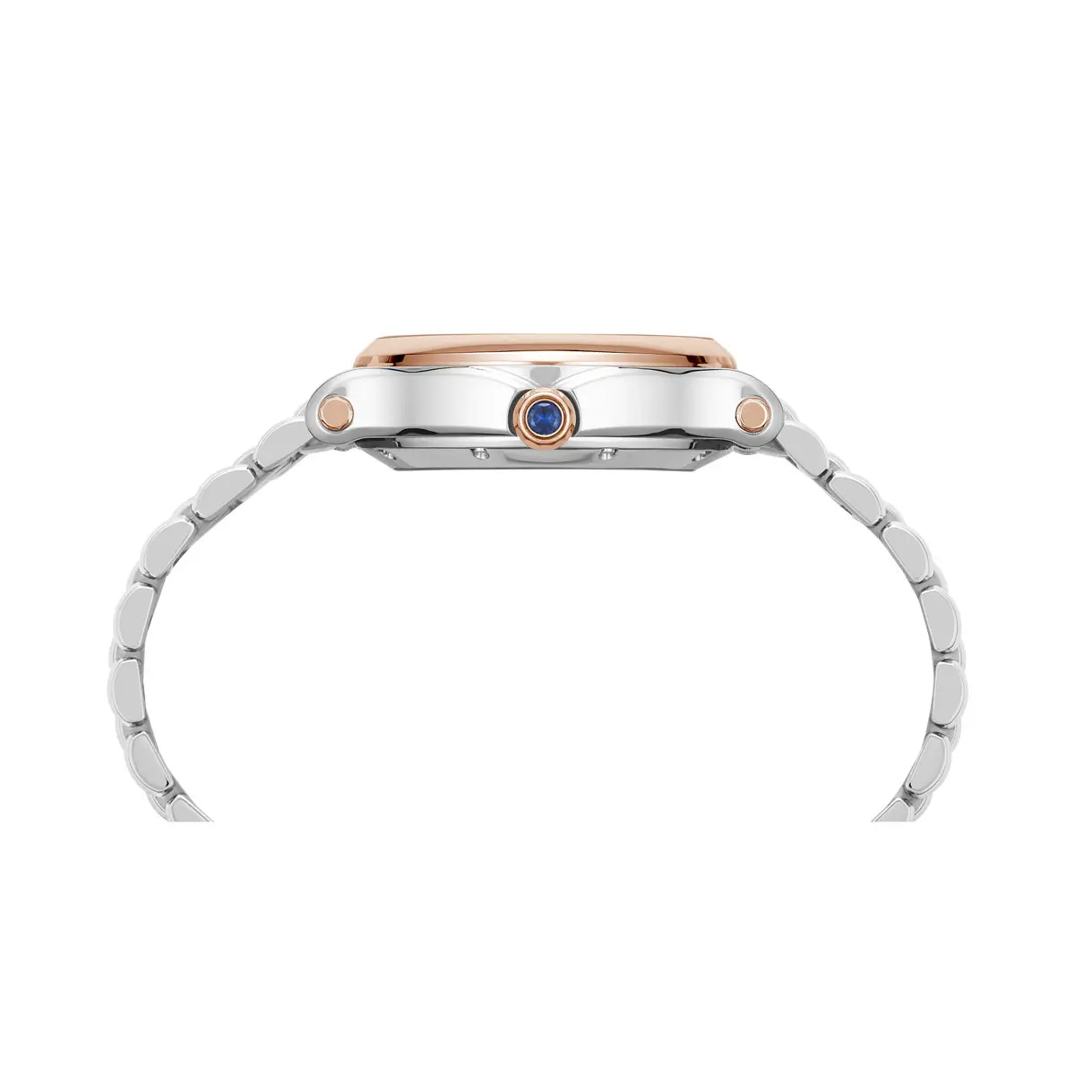 Овальный корпус размером 31,31 x 29 мм изготовлен из полированной нержавеющей стали, а безель из розового золота 18 карат придаёт тёплый, изысканный акцент. Сапфировое стекло защищает от царапин, а водонепроницаемость 3ATM / 30M делает часы подходящими для повседневной носки.