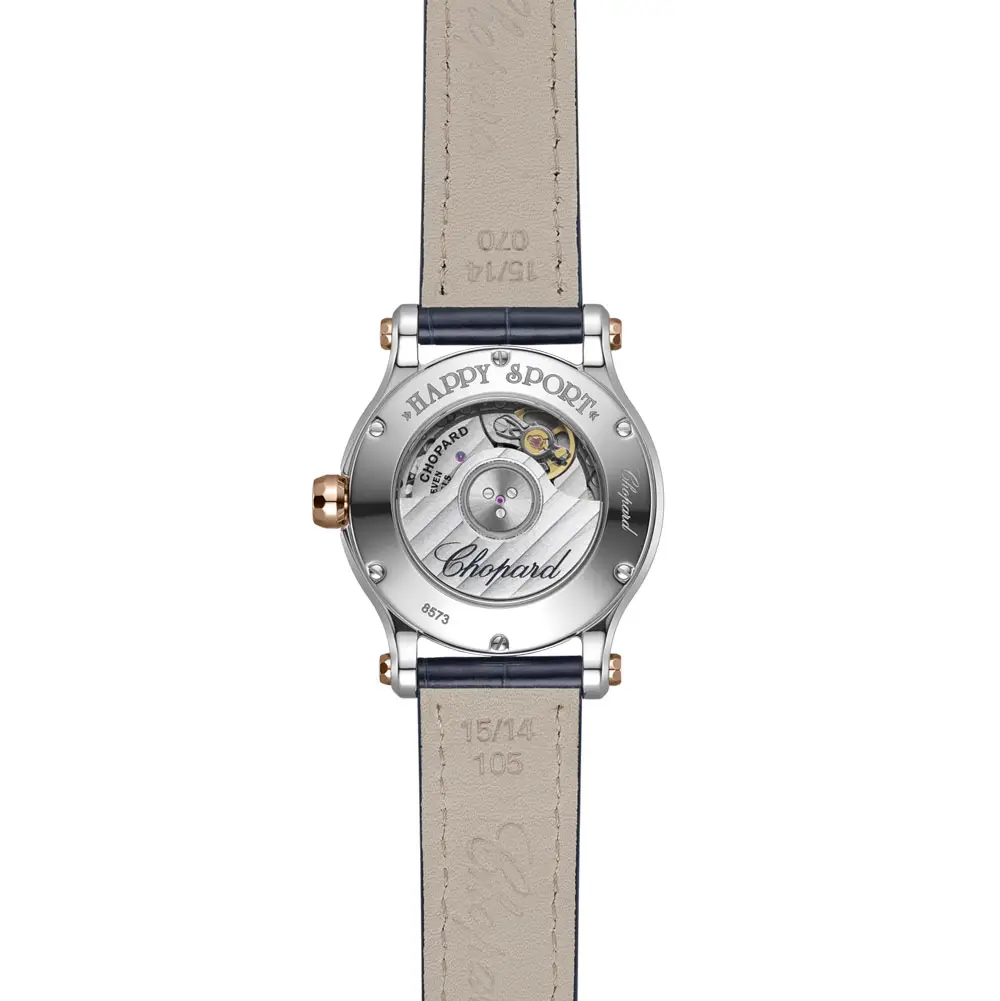 Синий ремешок из кожи аллигатора с классической застёжкой завершает элегантный дизайн. Внутри установлен автоматический швейцарский механизм, обеспечивающий плавный и точный ход. Chopard Happy Sport Sun, Moon and Stars 278573-6027 — это не просто часы, а ювелирное произведение, вдохновлённое вселенной, символ поэзии, света и вечной женской элегантности.