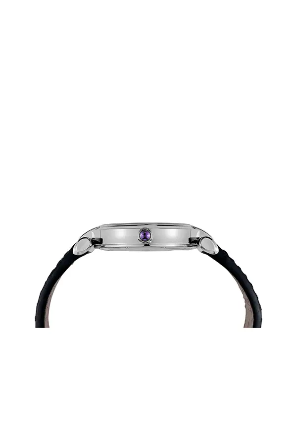 Корпус диаметром 36 мм, выполненный из полированной нержавеющей стали, подчёркивает чистоту линий и утончённый стиль. Под сапфировым стеклом расположен перламутровый циферблат с тонкими гравировками и римскими цифрами. Корону украшает кабошон из аметиста, придающий часам особый аристократический шарм.