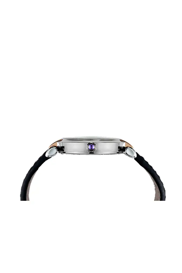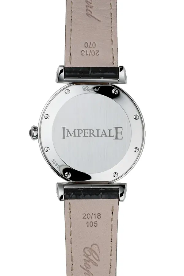 Корпус диаметром 36 мм изготовлен из нержавеющей стали и украшен вставками из 18-каратного розового золота, придающими часам мягкое, благородное сияние. Под сапфировым стеклом расположен серебристый циферблат с перламутровым центром, а на заводной головке блестит характерный аметист-кабошон, отличительный знак линии Imperiale.