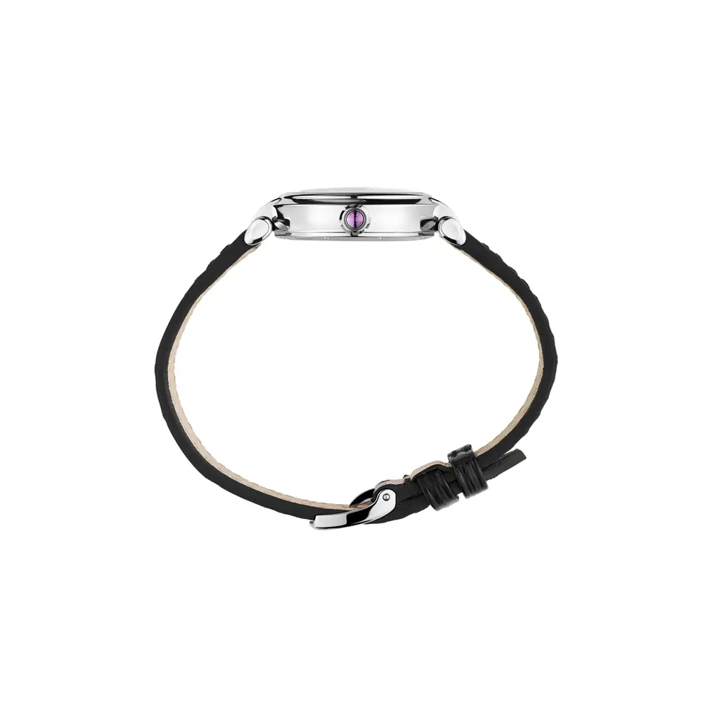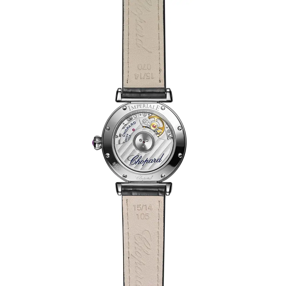 Корпус диаметром 29 мм изготовлен из нержавеющей стали и защищён сапфировым стеклом, устойчивым к царапинам. Циферблат из перламутра со стальными римскими цифрами и аккуратной датой выглядит утончённо и гармонично. На заводной головке сияет аметист-кабошон, фирменный знак коллекции Imperiale.