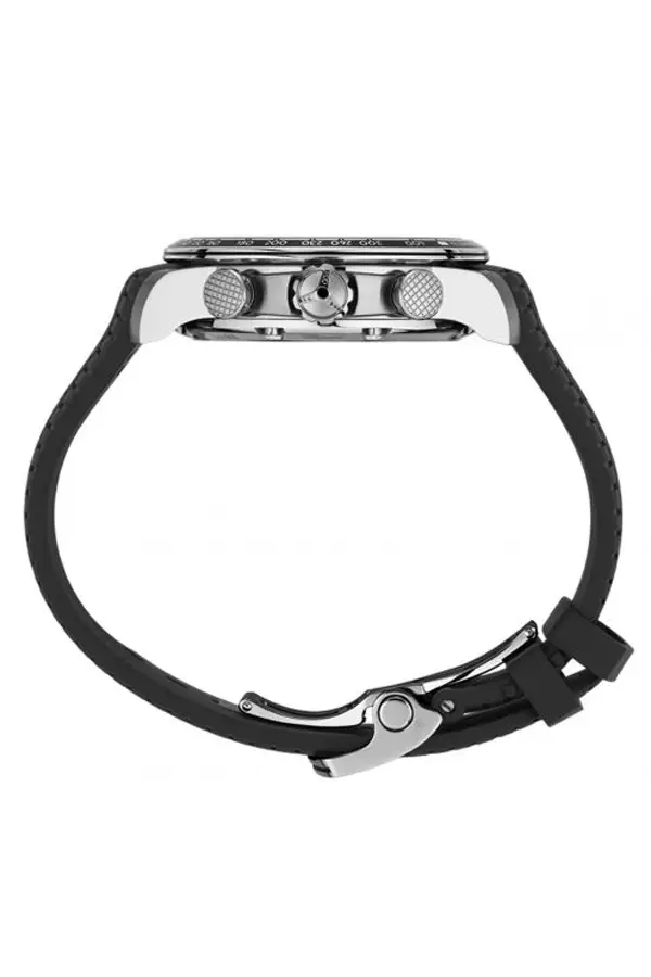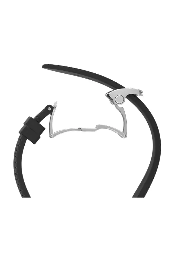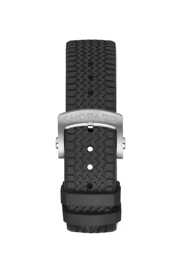 Ремешок из чёрного каучука с узором, вдохновлённым шинами Dunlop, и раскладывающейся застёжкой обеспечивают комфорт и безопасность.