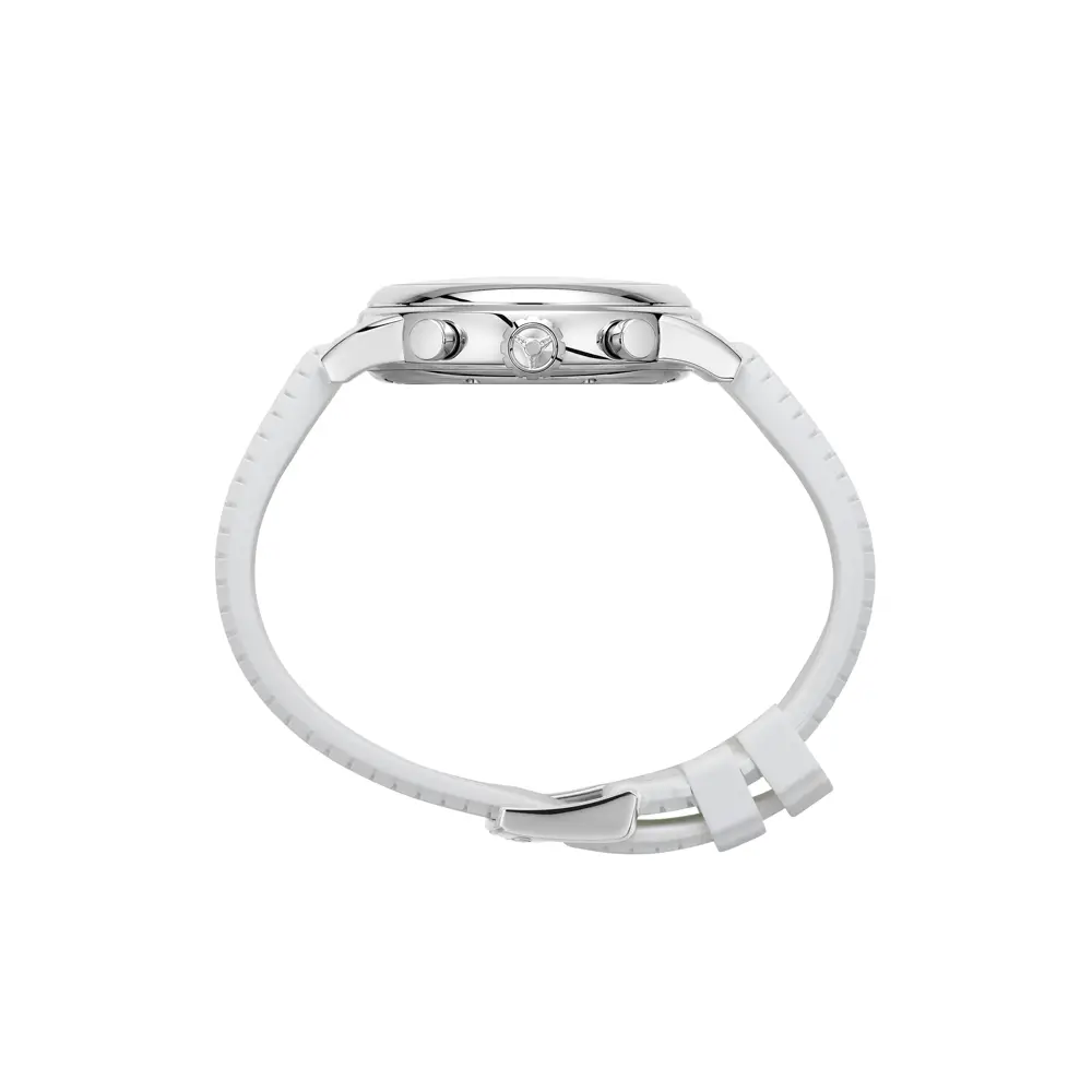 Серебристый циферблат, защищённый сапфировым стеклом, оснащён тремя счетчиками и удобным индикатором даты между 4 и 5 часами. Спортивный дух подчеркивается белым каучуковым ремешком с тонким рельефом и классической пряжкой, обеспечивающей максимальный комфорт.