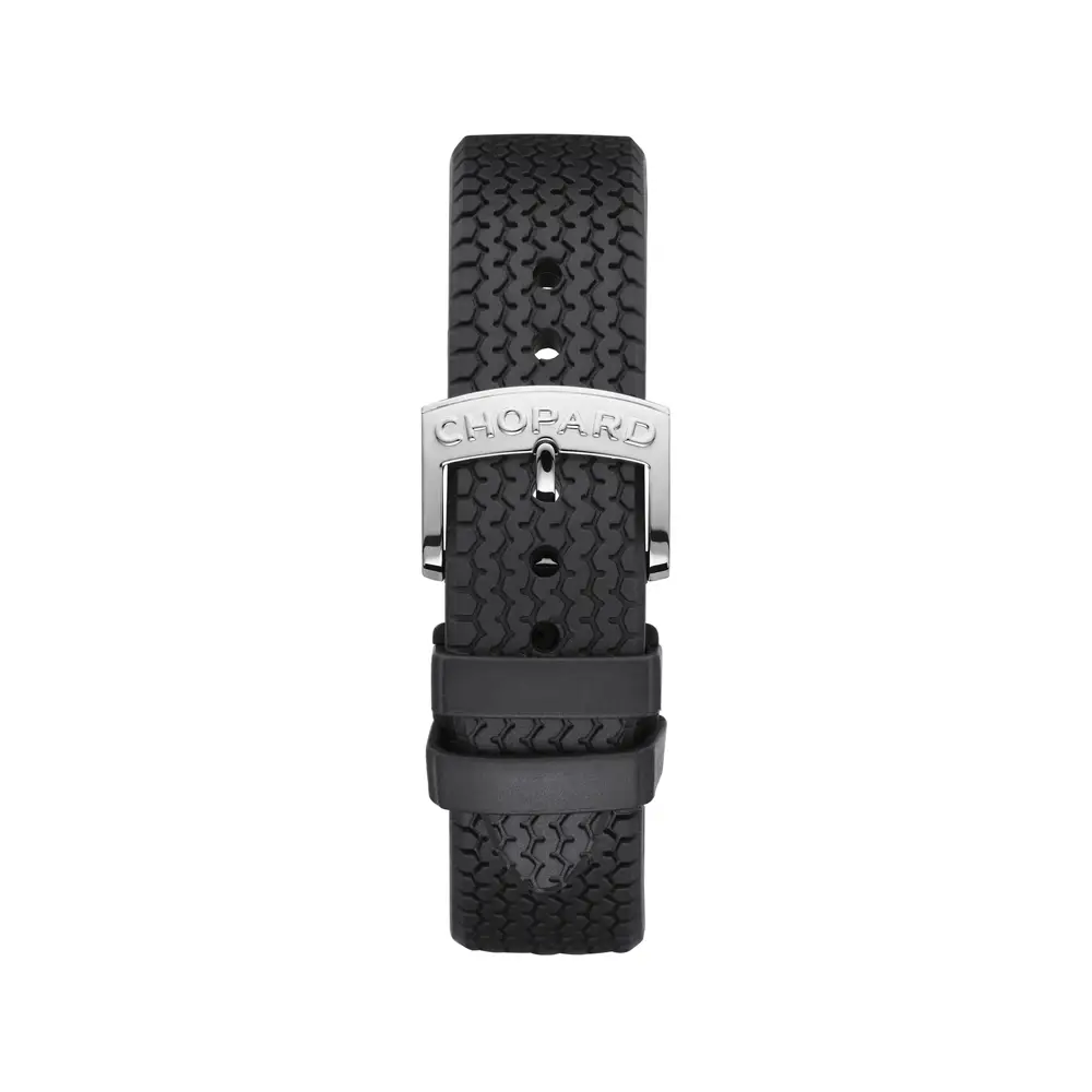 Модель Chopard Mille Miglia Classic Chronograph сочетает страсть к автоспорту с точностью швейцарского часового искусства. Круглый корпус из нержавеющей стали диаметром 42 мм обрамляет чёрный циферблат с хронографом и датой, защищённый сапфировым стеклом с антибликовым покрытием.