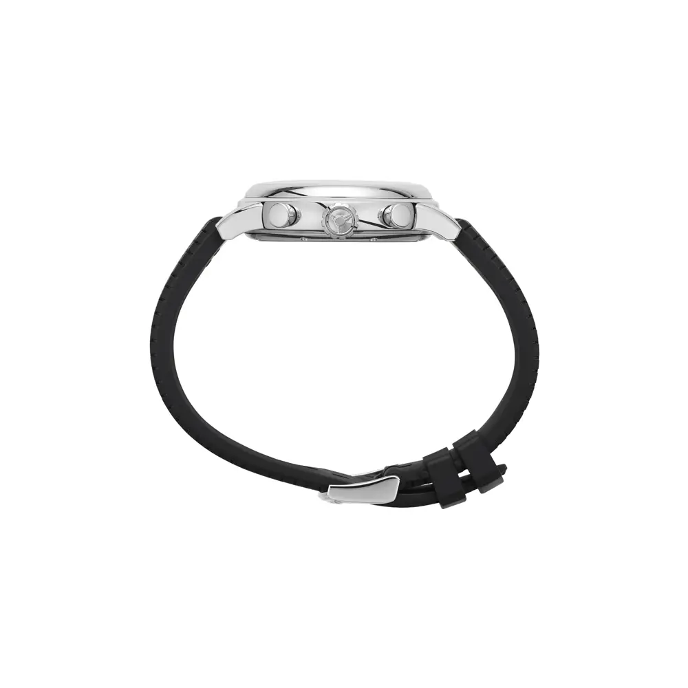 Чёрный каучуковый ремешок с рисунком протектора Dunlop и классической застёжкой подчёркивает гоночный стиль и комфорт.