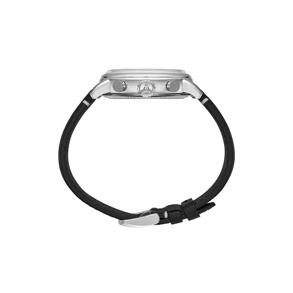 Чёрный кожаный ремешок с традиционной пряжкой гарантирует комфорт и надёжную посадку. Стальная безель дополняет мужской и сбалансированный стиль.