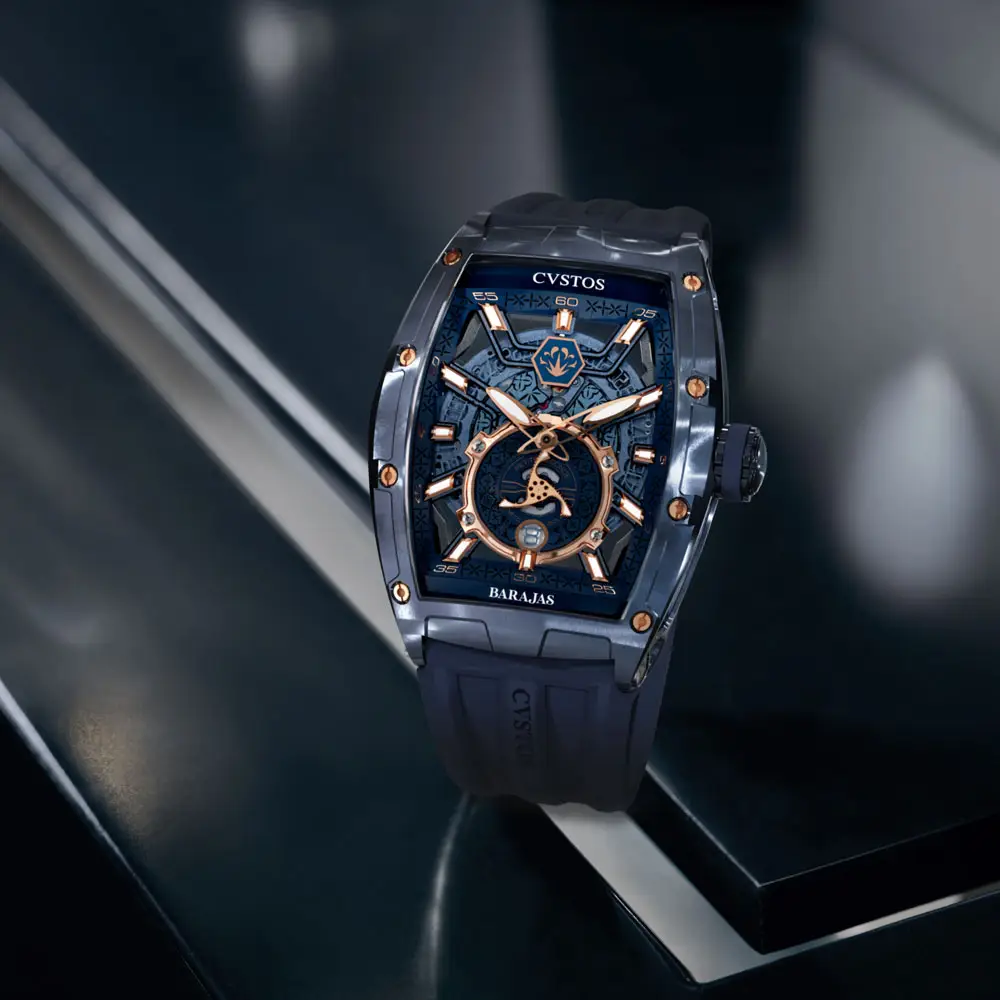 В основе лежит скелетонизированный автоматический механизм CVS410 с запасом хода 42 часа, который виден через сапфировое стекло с двухсторонним антибликовым покрытием. Чёрные PVD-мосты, открытые детали механизма и титановая заводная головка из розового золота Grade 5 подчёркивают внимание Cvstos к деталям.