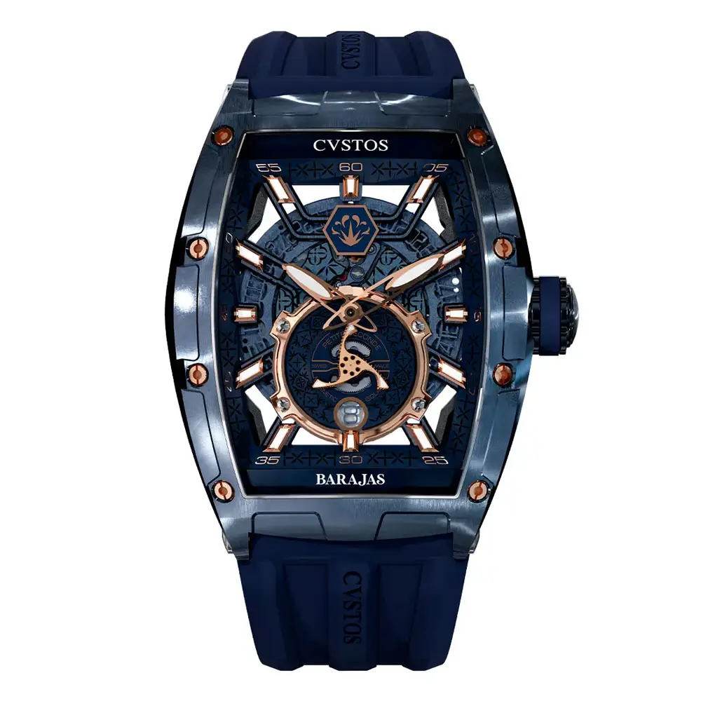 Cvstos Challenge Jetliner PS/Blue Steel 5N Comp/Tequila Barajas — это гармоничное сочетание авангардного дизайна, технического совершенства и роскошных материалов. Корпус формы tonneau размером 53,7 × 41 мм, выполненный из нержавеющей стали и розового золота 5N, создаёт изысканный баланс между мощью и утончённостью.