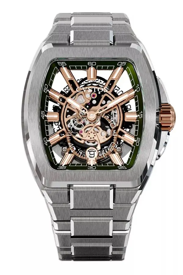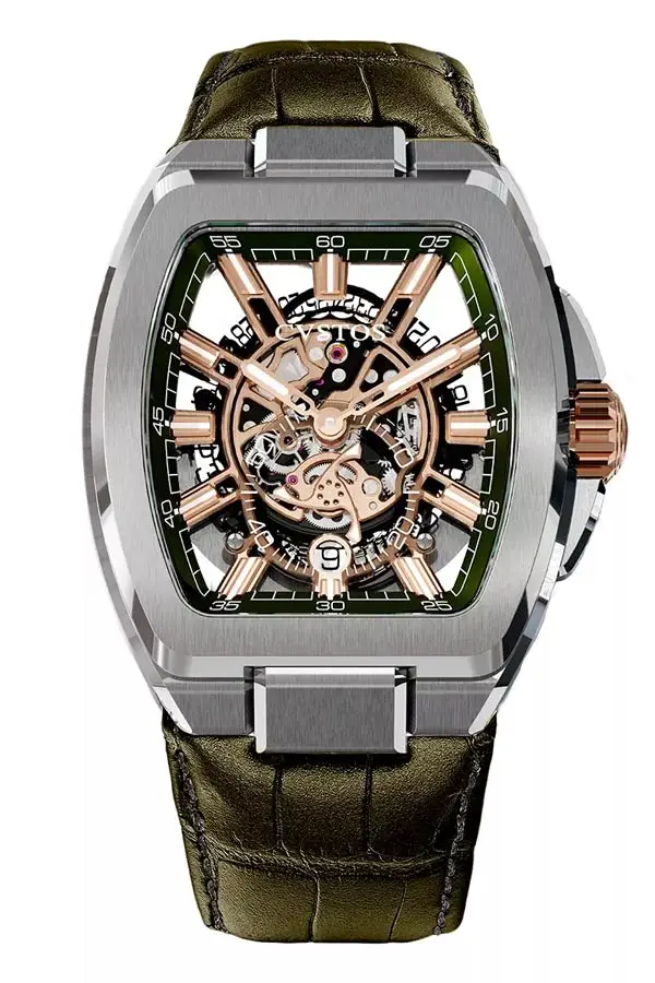 Бочкообразный корпус из титана размером 51 x 42 мм выглядит массивно, но остаётся лёгким и комфортным. Титан обеспечивает прочность и удобство при повседневной носке. Сапфировое стекло надёжно защищает золотистый скелетонизированный аналоговый циферблат, под которым работает механизм CVS410 SQLT с автоподзаводом и запасом хода около 42 часов.