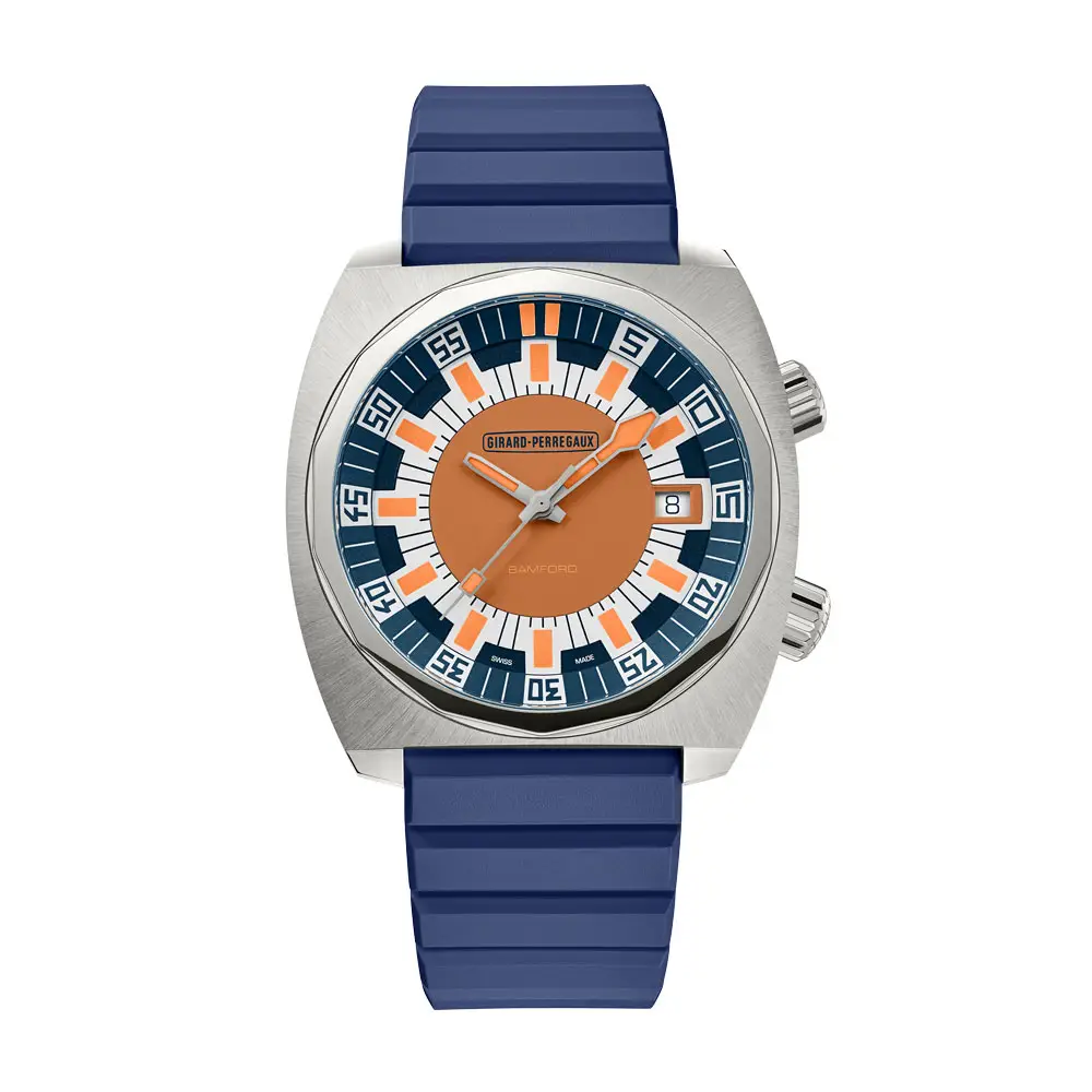 Girard-Perregaux Deep Diver 39500-21-3266-6CX - лимитированная серия (350 экземпляров), вдохновленная дайверской моделью 1969 года, созданная в сотрудничестве с часовым отделом Bamford. Модель предлагает ретро-дизайн в современном исполнении.