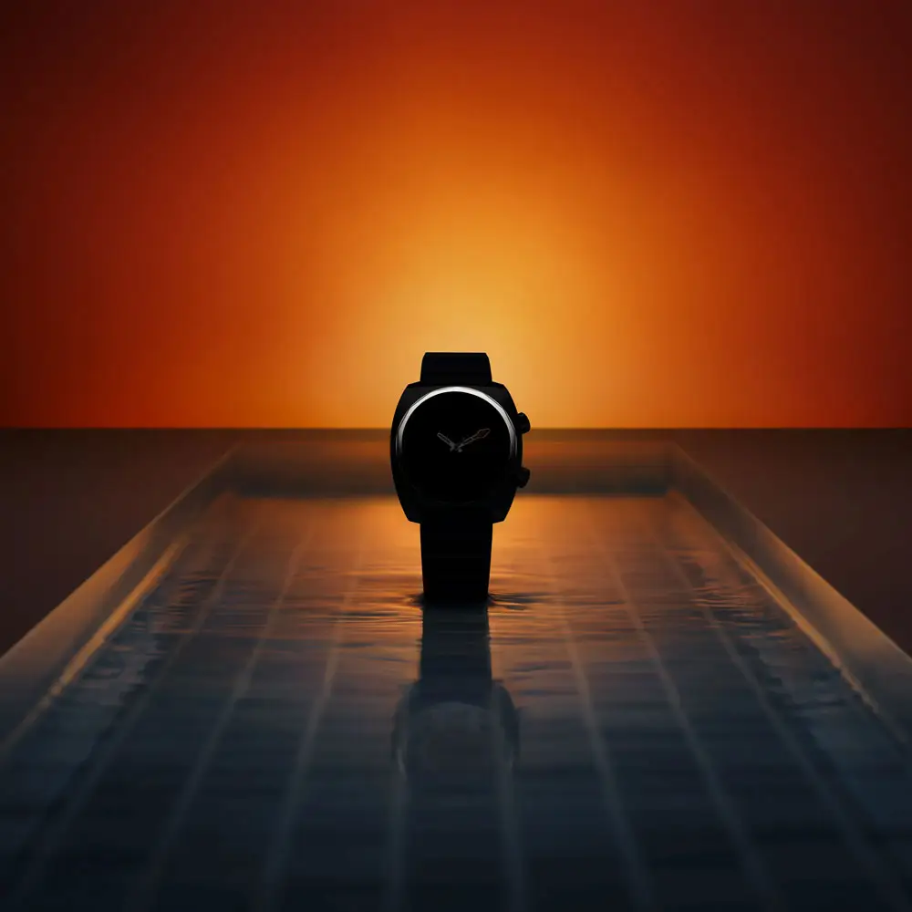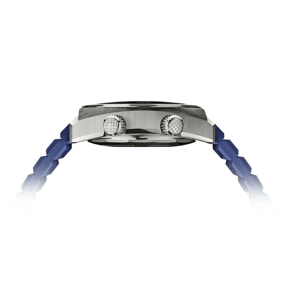 Титановый корпус 5-го класса (40,3 × 38 мм) прочный и легкий, водонепроницаемый до 200 м. Две заводные головки управляют внутренним вращающимся люнетом и регулировкой времени. Циферблат сочетает оранжевый, синий и белый цвета с характерными люминесцентными элементами.