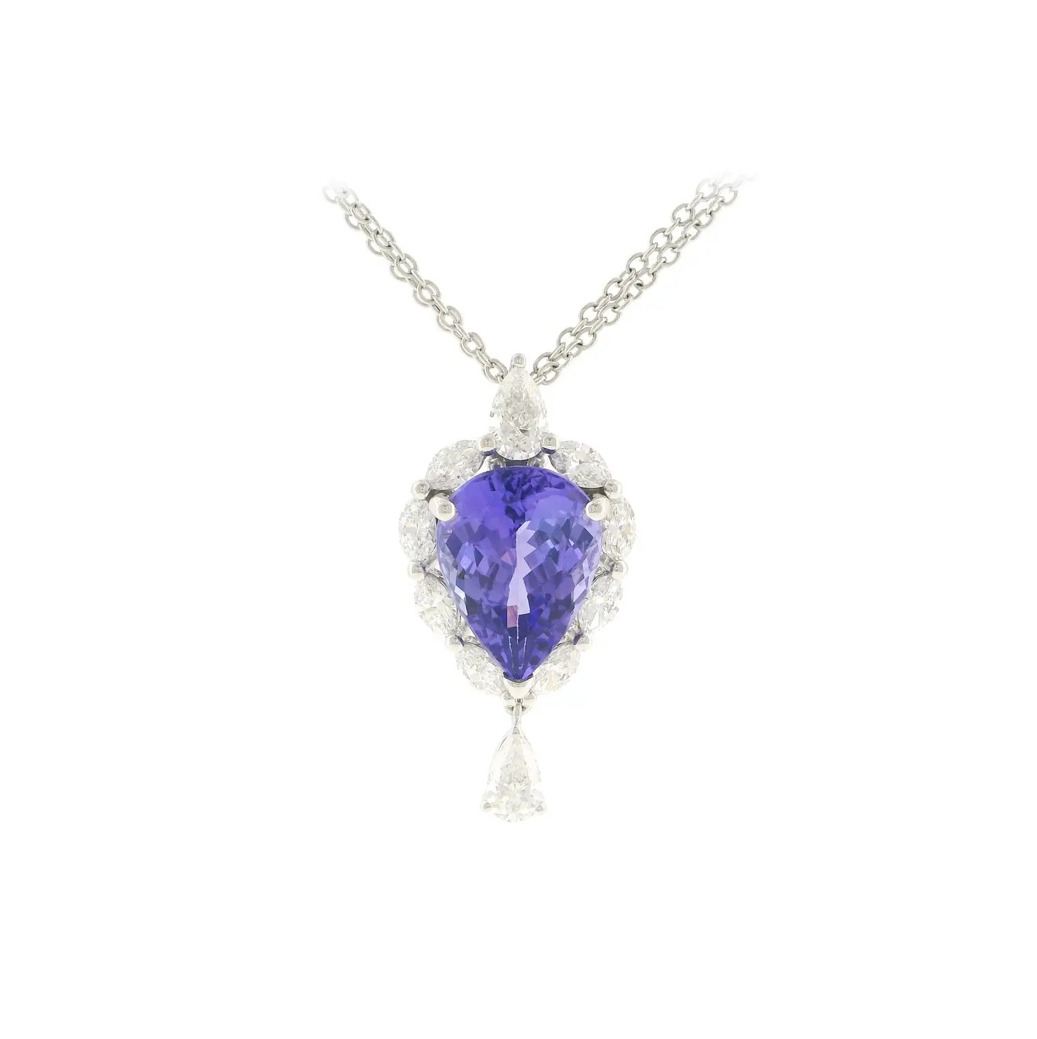 Это эксклюзивное колье из белого золота восхищает выразительной элегантностью и гармоничным сочетанием цветного драгоценного камня и сияющих бриллиантов. Центральным элементом является натуральный танзанит весом 4,93 карата, отличающийся насыщенным сине-фиолетовым оттенком и завораживающей игрой света. Точная закрепка подчёркивает его каплевидную форму и позволяет полностью раскрыть блеск и глубину цвета.