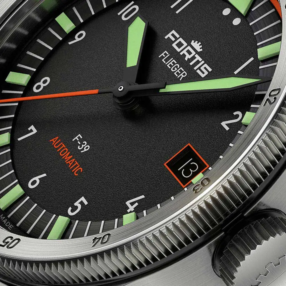 Матово-чёрный циферблат с крупными стрелками и метками, покрытыми Super-LumiNova® X1, гарантирует отличную читаемость днём и ночью. Поворотный 12-часовой безель позволяет отслеживать вторую временную зону, а оранжевая метка Synchroline® помогает точно синхронизировать время — фирменные детали, отражающие авиационное наследие Fortis.