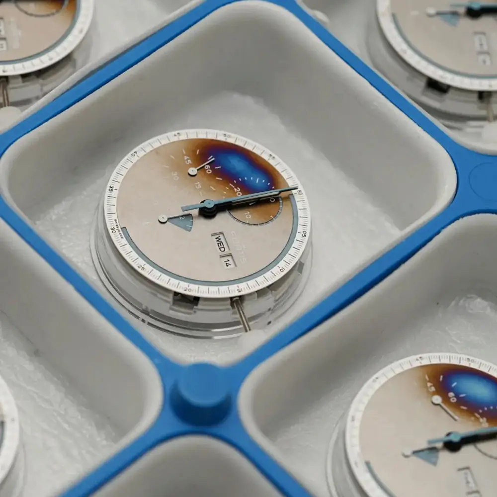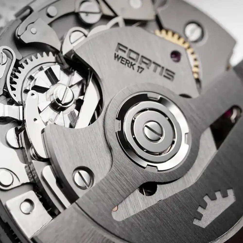 Внутри установлен мануфактурный калибр Fortis WERK 17 с запасом хода до 60 часов. Механизм оснащён колёсным хронографом (column-wheel), функцией день/дата, малой секундой и стоп-секундой. Циферблат защищён сапфировым стеклом с антибликовым покрытием, а прозрачная задняя крышка открывает вид на механизм.