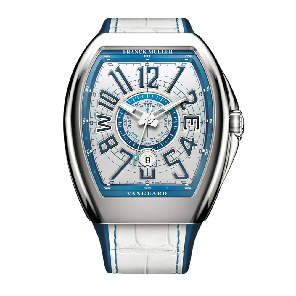 Коллекция Vanguard Mariner объединяет часовое мастерство Franck Muller с навигационной и компасной эстетикой, создавая чистый и технически ориентированный образ. В версии V 45 YT SC DT MAR (AC) ключевым элементом выступает серебристый гильоше-циферблат со стилизованной розой ветров, дополненный объёмными синими цифрами, усиливающими читаемость и элегантность.