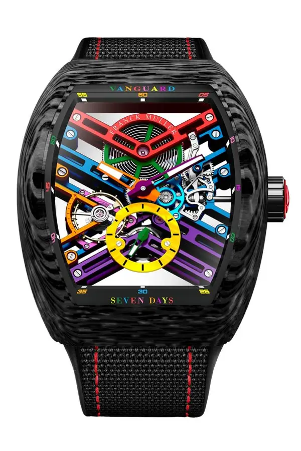 Такие элементы дизайна, как крупные накладные цифры, выразительные стрелки, спортивные каучуковые или текстильные ремешки и скелетонизированные циферблаты, придают коллекции Vanguard особый и современный вид. Часы часто оснащены такими усложнениями, как хронограф, турбийон или автоматический калибр даты. Все они работают на собственных механических механизмах Franck Muller.