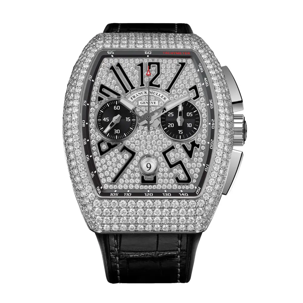 Коллекция Vanguard сочетает спортивный характер с техническим дизайном и фирменным tonneau-корпусом. Версия V 45 CC DT D CD (NR) относится к наиболее эксклюзивным моделям линейки благодаря полной бриллиантовой отделке корпуса и циферблата, что придает часам выраженный ювелирный акцент. Накладные арабские цифры, контрастные счетчики хронографа и архитектурная композиция циферблата создают баланс между haute horlogerie и динамичной спортивной эстетикой.
