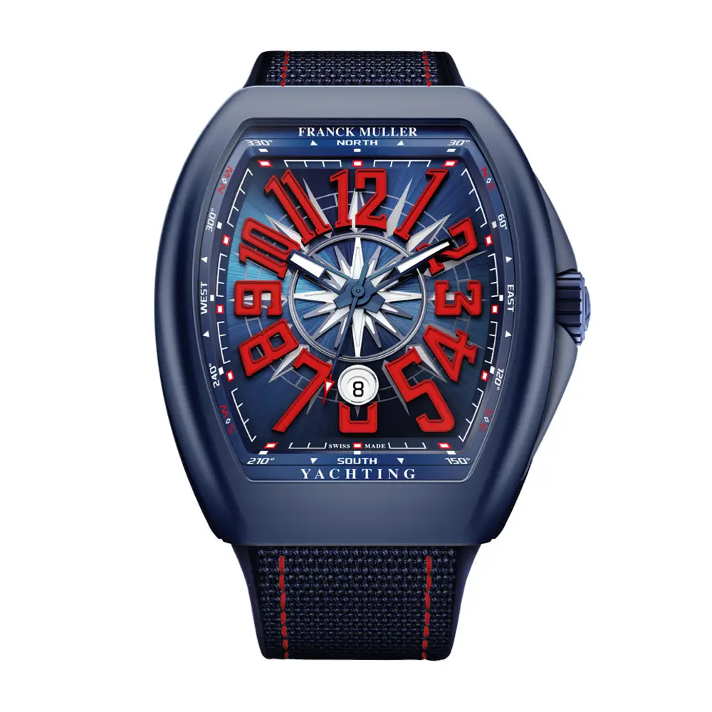 Коллекция Vanguard Yachting раскрывает эстетику Franck Muller через морскую тематику и ориентирующие элементы. В модели V 45 SC DT YACHT CR BL MC (BL) контрастируют синий циферблат с розой ветров и объёмные красные цифры, подчёркивая энергичность дизайна и удобство считывания.
