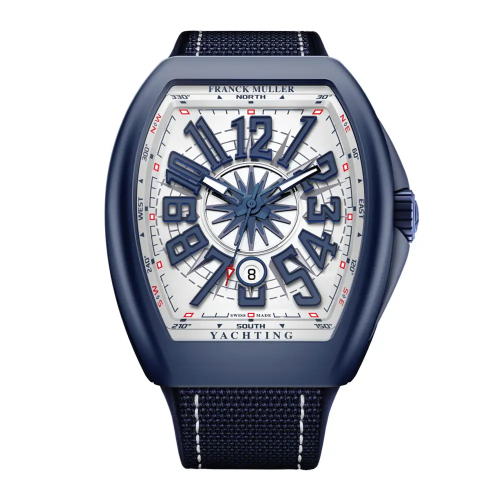Коллекция Vanguard Yachting объединяет эстетику Franck Muller с морской тематикой и ориентирующими элементами. В модели V 45 SC DT YACHT CR BL MC (BL) используется светлый циферблат с компасной розой, дополненный темно-синими объёмными цифрами, создающими контраст и удобочитаемость.