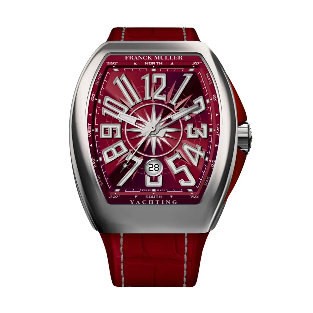 Franck Muller Vanguard Yachting V43 SC DT YACHT (BO) — это сочетание швейцарской часовой точности и морского вдохновения. Корпус из полированной нержавеющей стали размером 42,5 × 52,7 мм украшен эффектными бордовыми вставками по бокам. Прочное сапфировое стекло устойчиво к царапинам, а водонепроницаемость до 30 метров делает часы подходящими для повседневного ношения.