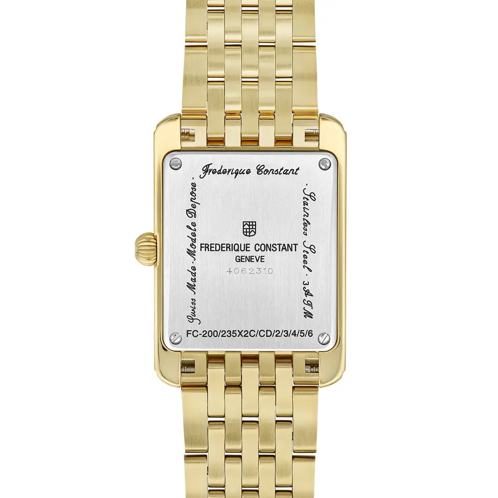 Модель Frederique Constant Classics Carrée Small Seconds FC-235S2C5B представляет элегантную интерпретацию стиля ар-деко в современном унисекс-формате. Прямоугольный корпус с золотым PVD-покрытием обрамляет серебристый циферблат с римскими цифрами, изящными стрелками и малой секундной стрелкой над отметкой «6 часов». Дизайн выглядит гармонично и вне времени, делая часы выразительным аксессуаром как для повседневного, так и для официального образа.
