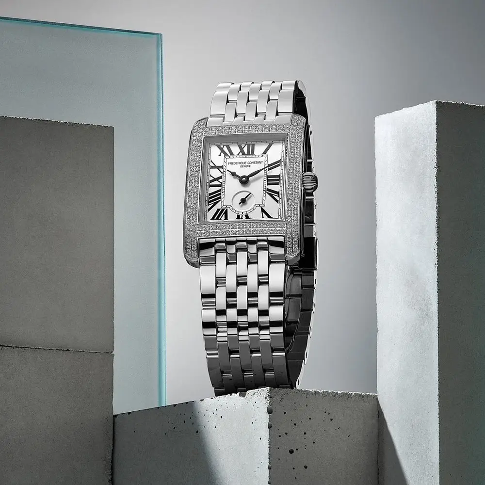 Часы Frederique Constant Classics Carrée Small Seconds FC-235S2CD6B воплощают идеальное сочетание ювелирного искусства и часового мастерства в стиле ар-деко. Характерный прямоугольный корпус (36 × 25,2 мм) из полированной нержавеющей стали украшен 158 бриллиантами (1,185 карата), придавая модели роскошный вид. Сапфировое стекло с антибликовым покрытием защищает от царапин, а водозащита 30 м (3 ATM) подходит для повседневного использования.