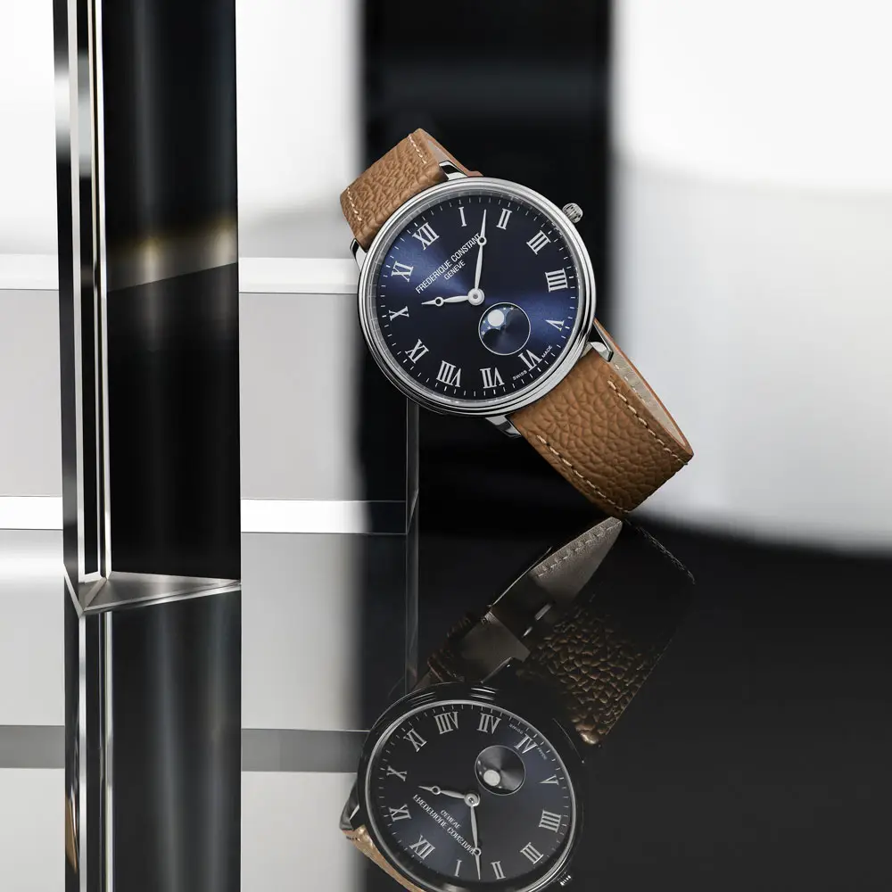 Часы Frederique Constant Classics Quartz Moonphase сочетают в себе утонченную классику и швейцарскую точность. Корпус из нержавеющей стали диаметром 39 мм обладает гармоничными пропорциями и подходит как для мужского, так и для женского запястья. Глубокий синий циферблат с римскими цифрами подчёркивает элегантный и сдержанный стиль модели.