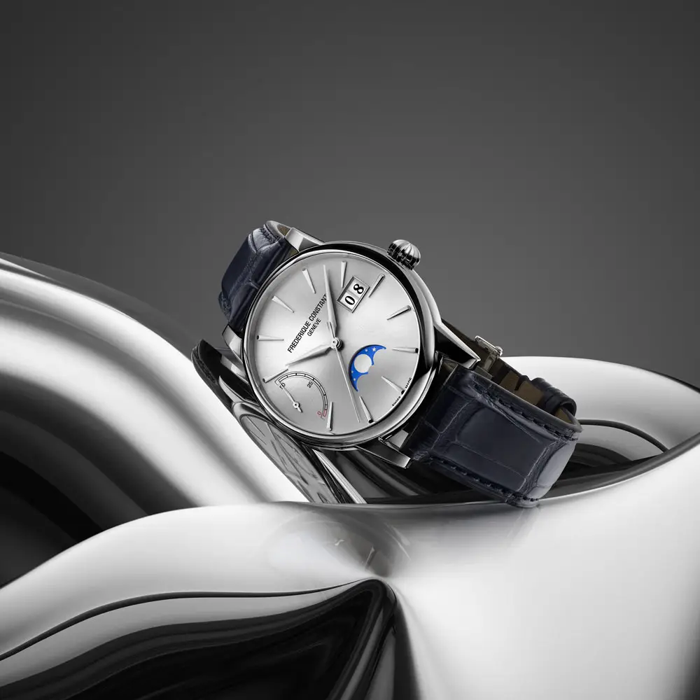 Frederique Constant FC-735S3H6 — это исключительные механические часы, сочетающие классическую элегантность с усложнениями, которые оценит каждый знаток швейцарского часового искусства. Стальной корпус 40 мм обрамляет серебристый циферблат с большой датой, индикатором запаса хода и фазой Луны – всё в изящно сбалансированном и вечном дизайне.