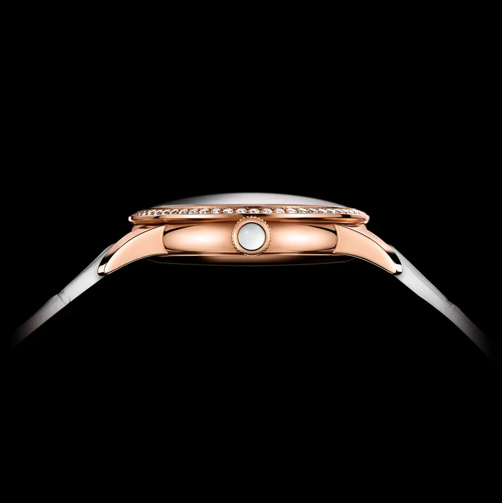 Под прочным сапфировым стеклом скрывается исключительный перламутровый циферблат, украшенный изящно закреплёнными бриллиантами и практичной датой, повышающей функциональность часов. Внутри расположен механический автоматический механизм, гарантирующий точность хода и долгий срок службы.