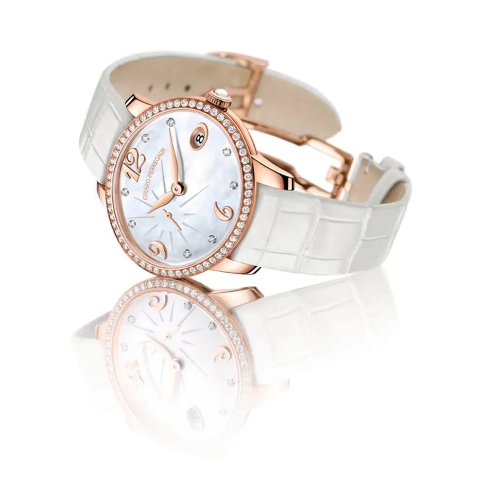 Часы Girard-Perregaux Cat’s Eye — это утончённое украшение, которое привлечет внимание ценительниц роскоши и изысканного стиля. Элегантный овальный корпус размером 35,4 x 30,4 мм выполнен из 18-каратного розового золота и украшен бриллиантами, аккуратно инкрустированными в безель, придающими часам ослепительное сияние.