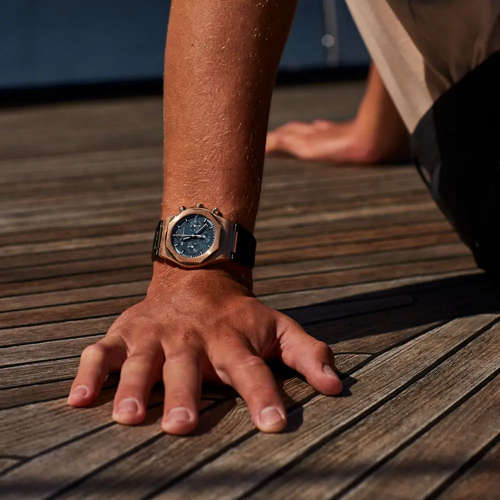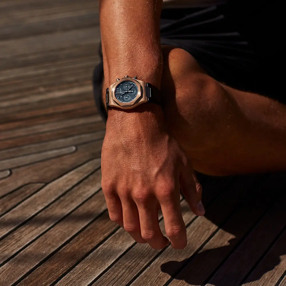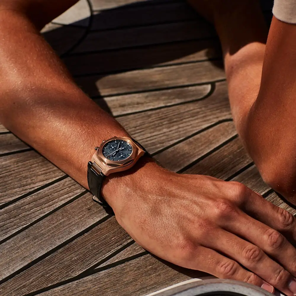 Динамичный и одновременно элегантный дизайн дополняет синий ремешок из кожи аллигатора с удобной раскладывающейся застёжкой, гарантирующий комфорт и безопасность при ношении. Благодаря водонепроницаемости 5 ATM (50 метров) часы подходят для ежедневного использования, включая лёгкий контакт с водой.