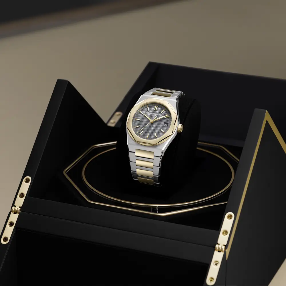 Под сапфировым стеклом с антибликовым покрытием расположен серый циферблат с узором Clous de Paris и эффектом солнечного луча, который придаёт глубину и изысканность. Накладные метки и позолоченные стрелки гармонично перекликаются с золотым безелем, а окошко даты на позиции 3 часов сохраняет идеальную симметрию.
