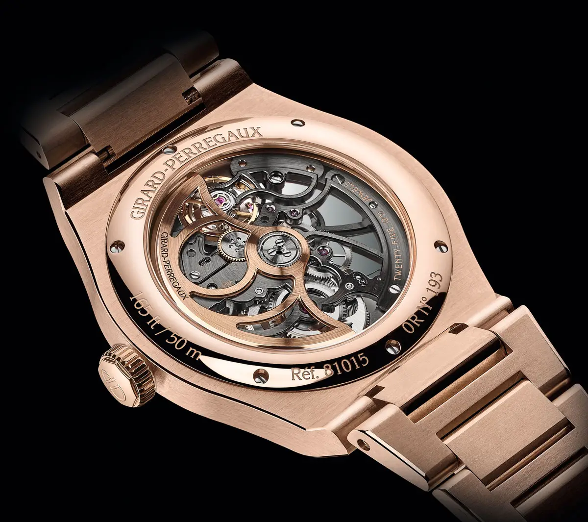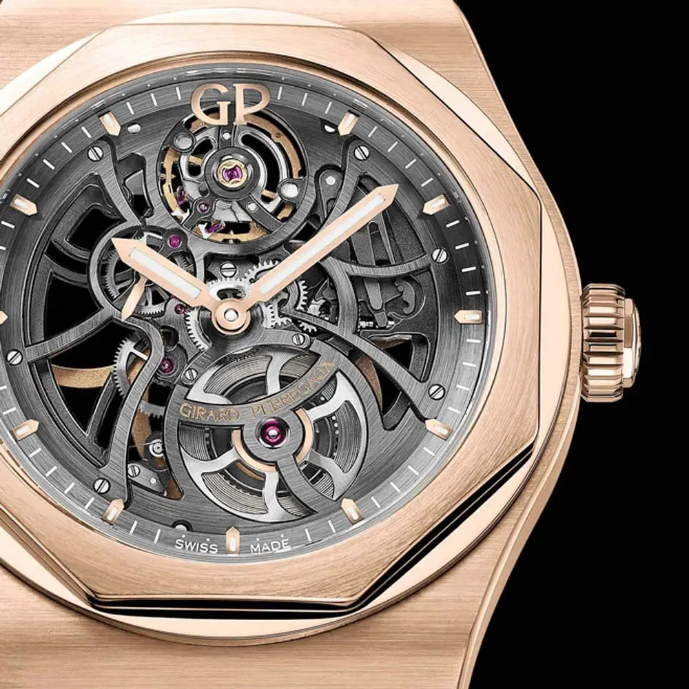 Внутри работает автоматический калибр GP01800-0006 с запасом хода 54 часа, отличающийся точностью и элегантной конструкцией. Laureato Skeleton воплощает роскошь, инновации и страсть к часовому делу, отражая дух Girard-Perregaux.